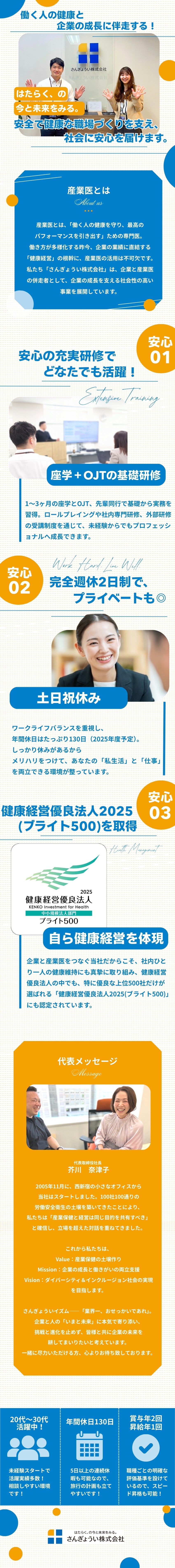 また、企業の人事担当者、産業医、医療従事者と関わることで、コミュニケーション力・調整力・専門知識が磨かれ、大きく成長できる点も魅力です!