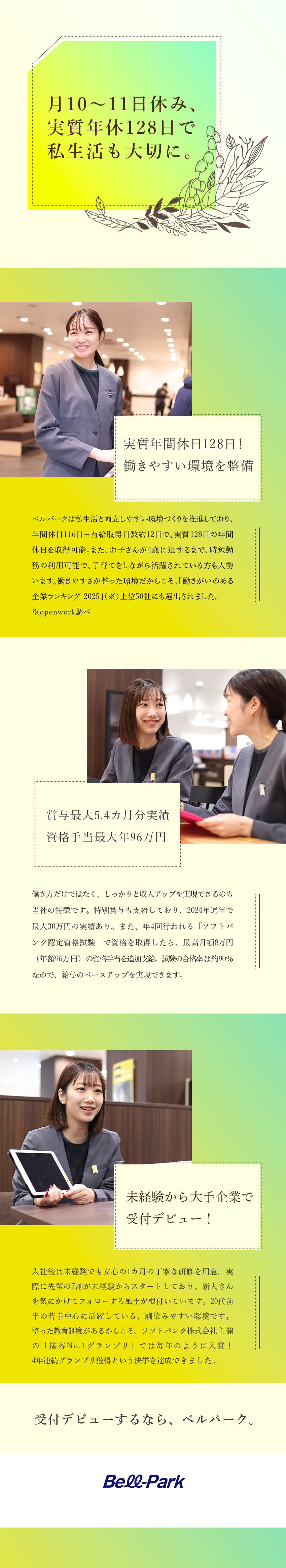 ベルパークの特徴は未経験からでも安心して始められ、受付・店舗責任者にとどまらないその先のキャリアを描ける場所であること。