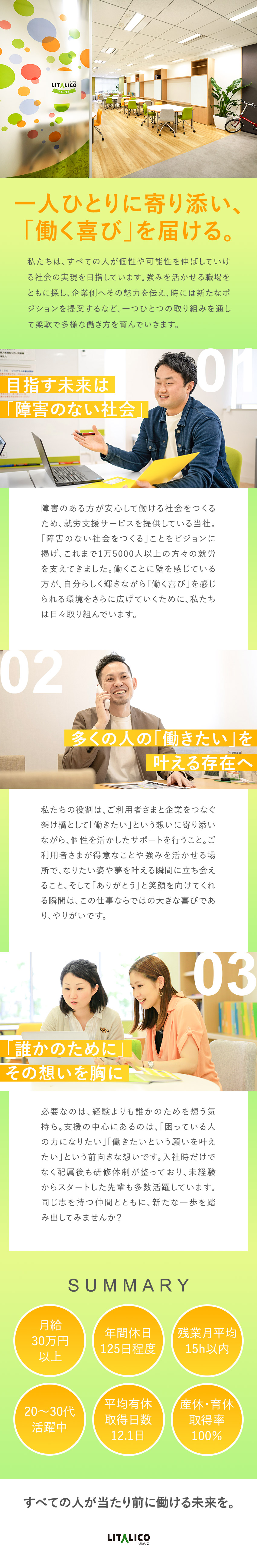 LITALICOワークスの仕事は、このビジョンを「働く」という場面で実現する最前線です。その人が持つ素晴らしい力や個性が、社会の画一的な「働き方」という仕組みによって発揮できずにいる状況を変えたいのです。