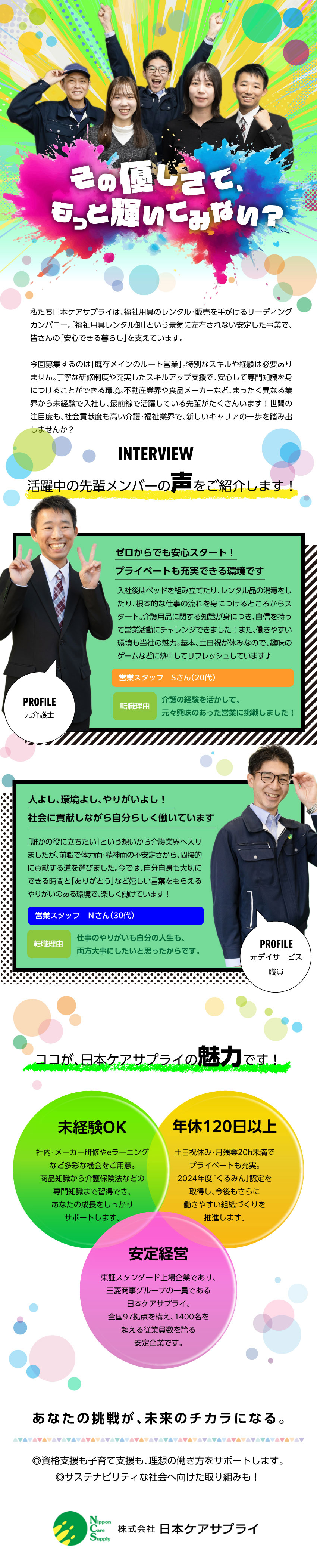 福祉用具のルート営業/土日祝休/残業20h未満/20代活躍中