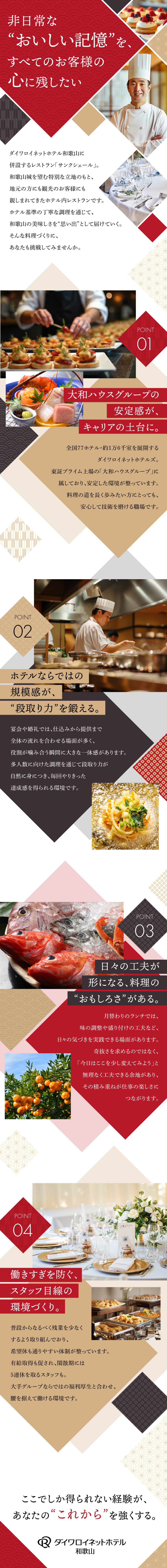 全国に多くのホテルを展開するダイワロイネット。その中で和歌山の「サンクシェール」は、唯一ホテル自身が運営しているレストランです。大和ハウスグループの安心感がありながら、新メニューなど現場で判断できる自由度も魅力です。