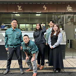 本社機能を持つ精肉店前での集合カット。それぞれのキャラクターが良い味を出しているスタッフたちです。