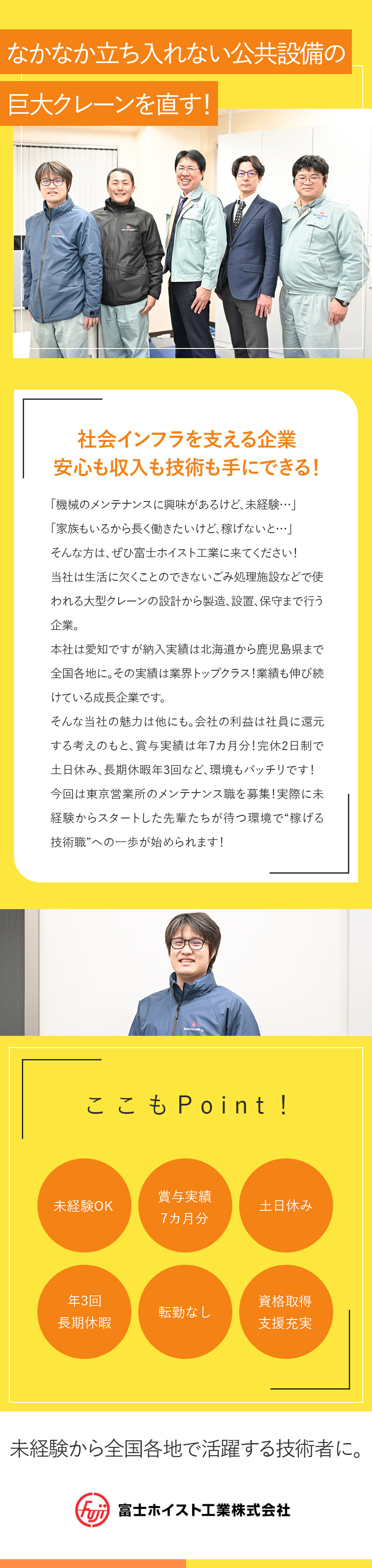技術職(メンテナンス)/未経験OK/賞与7カ月分/土日休み