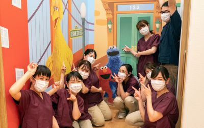 キャップスクリニックは「こわい」「痛い」場所ではなく、「学べる楽しい場所へ」という想いがあり、セサミストリートの内装デザインにしています。