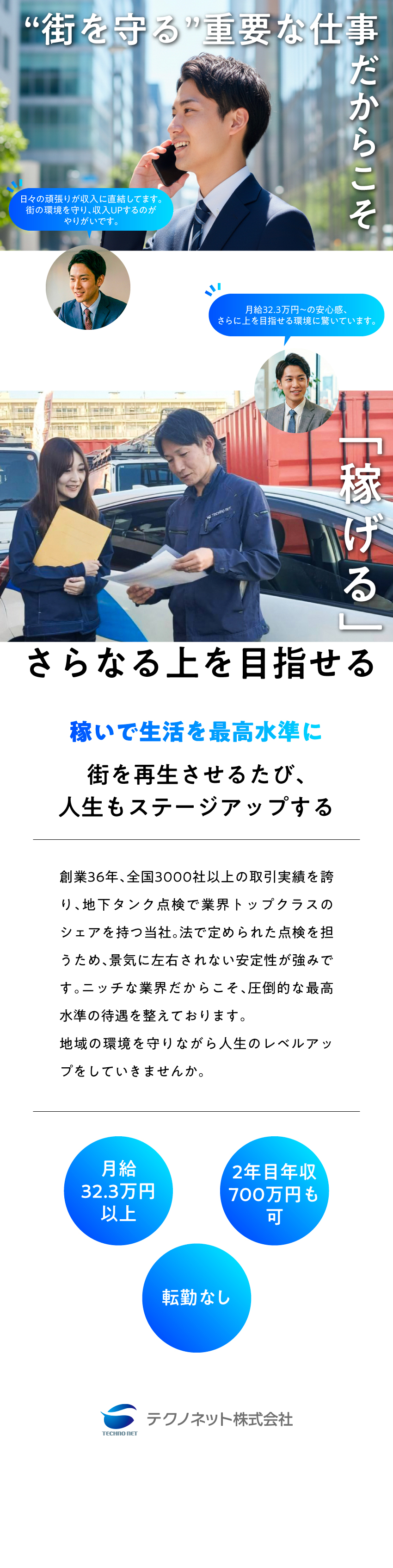創業36年・取引先3000社以上の当社は、地下タンクの点検において業界トップシェアを誇ります。会社が安定して成長していることに加え、社長の「社員全員で豊かになりたい」という想いから、待遇面でも業界トップクラスの水準を実現できているんです!