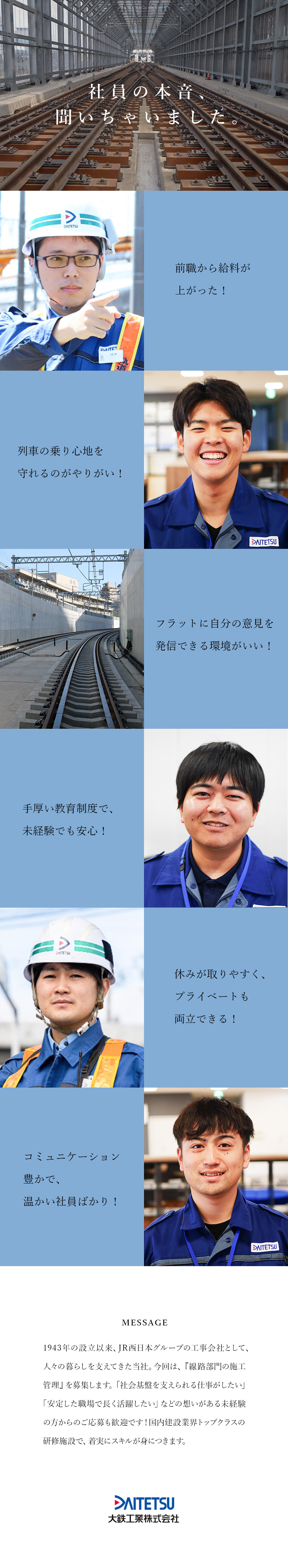 工事のスケールが大きいのも魅力の一つ。数あるゼネコンのなかで、同社のような鉄道工事に精通した工事業者は、なかなかありません。研修体制も整っているため、未経験者はイチから学びスキルを身につけることができ、経験者であればさらに希少な技術を磨くことができる環境です。
