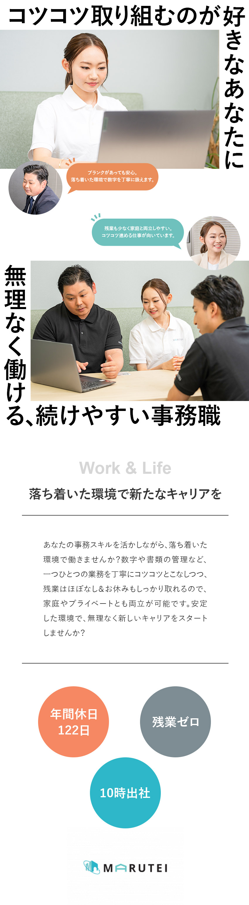 事務職/年休122日/10時出社/原則定時退社/転勤なし