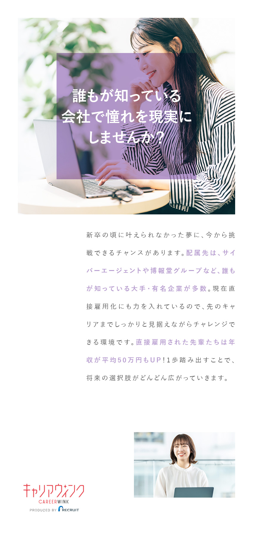 NEW事務職/未経験者約8割/希望者の7割が大手企業へ直接雇用