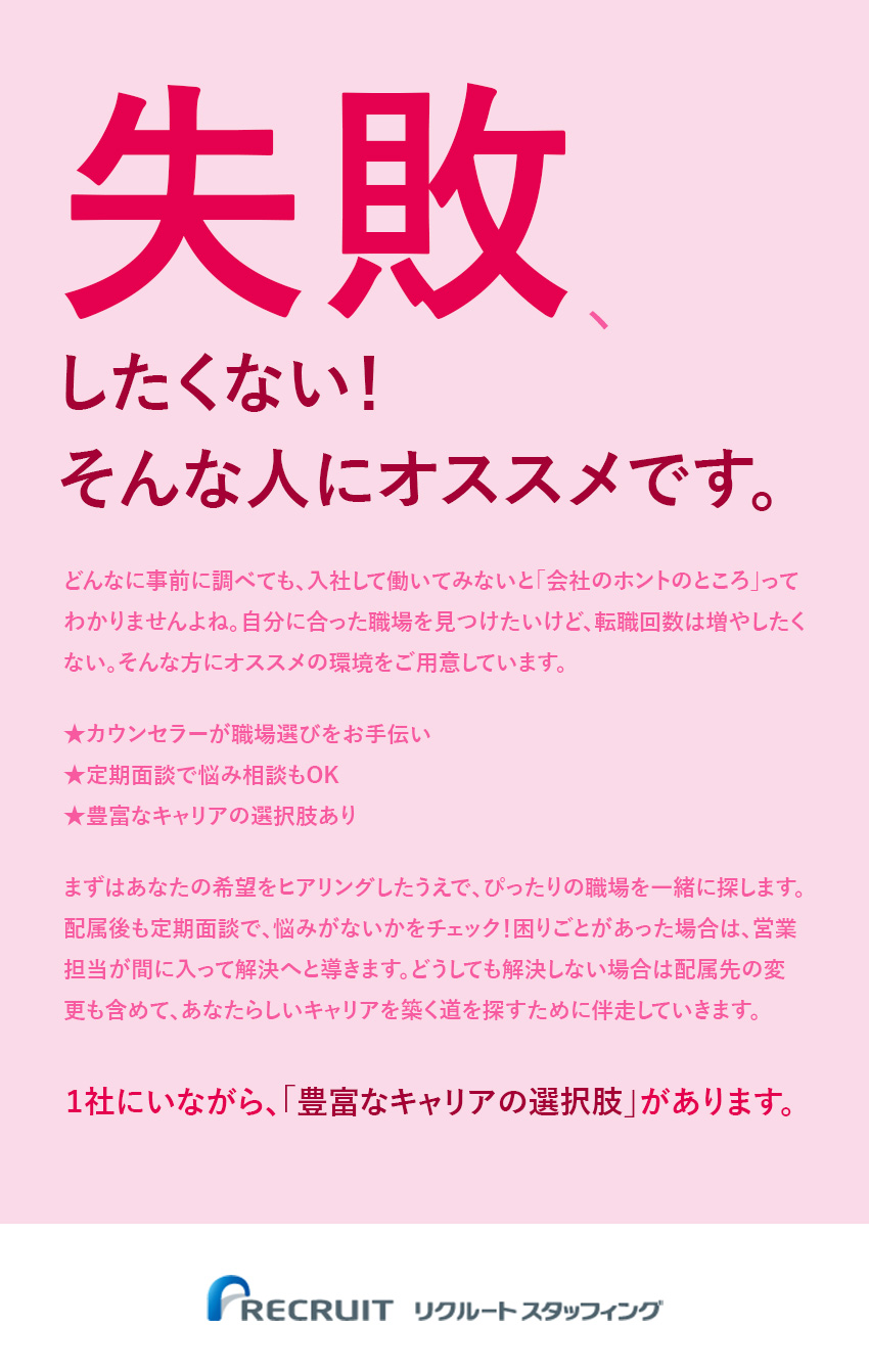 雇用主はあくまでリクルートスタッフィング。就業先では同社の看板を背負ってお仕事をするため、ときには責任を感じることがあるかもしれません。