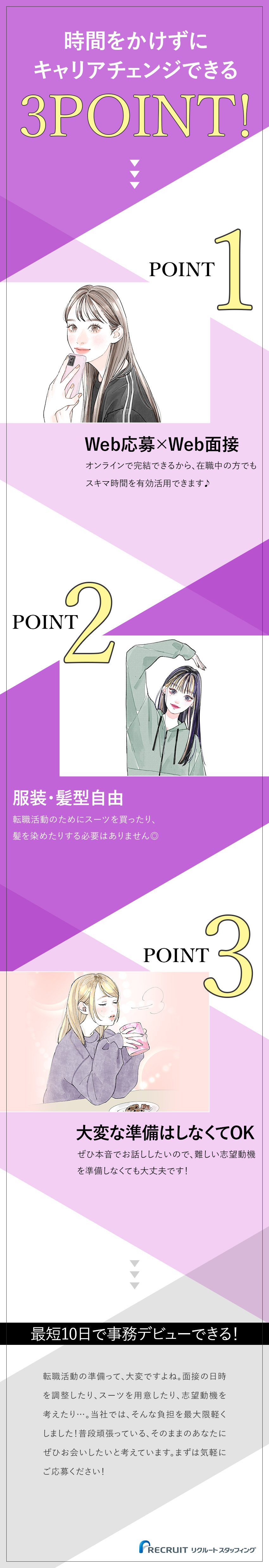 NEW定着率98%!事務職/就業先は大手企業/残業少/土日祝休