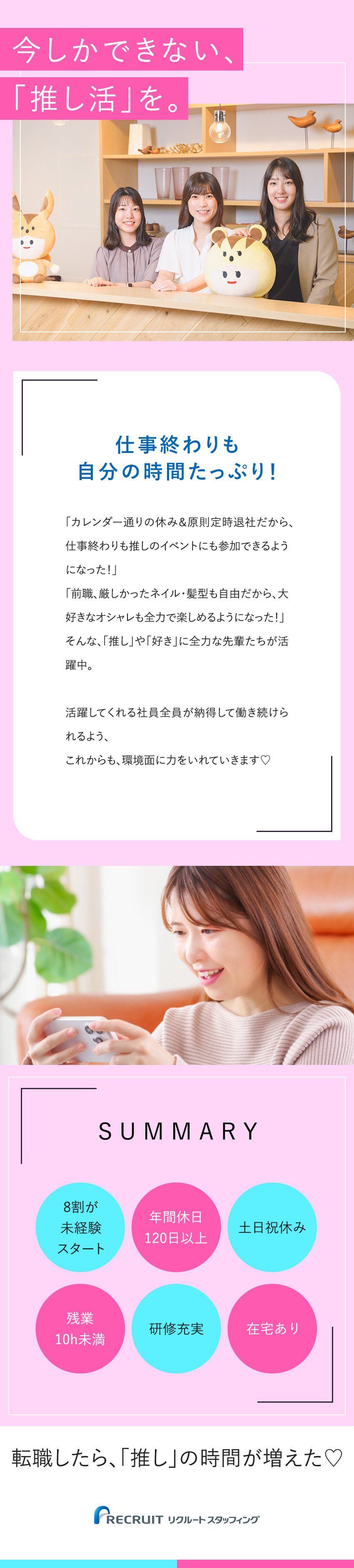 【安心!】8割が未経験スタート!手厚い研修あり◎/【満喫!】土日祝休/年休120日以上/残業月10h/【安定!】リクルートグループ!直接雇用も◎/株式会社リクルートスタッフィング(リクルートグループ)