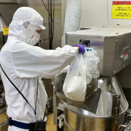 小麦粉や調味料などを指示通りに計量し、機械で混ぜ合わせます。