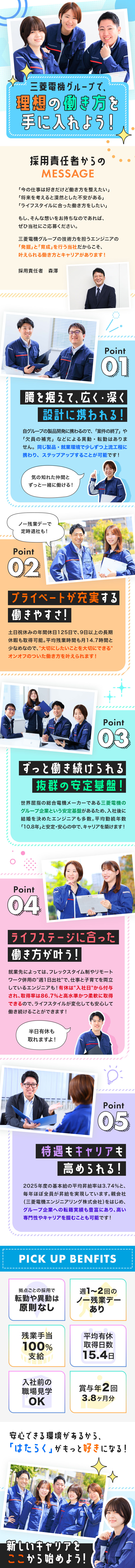 【愛知県稲沢市/勤務地固定】昇降機の機械設計◇三菱電機Gで福利厚生や働き方を整える