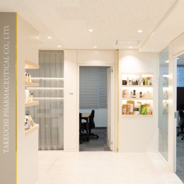 社内の様子。落ち着いた雰囲気の廊下には開発した商品等が陳列されています。
