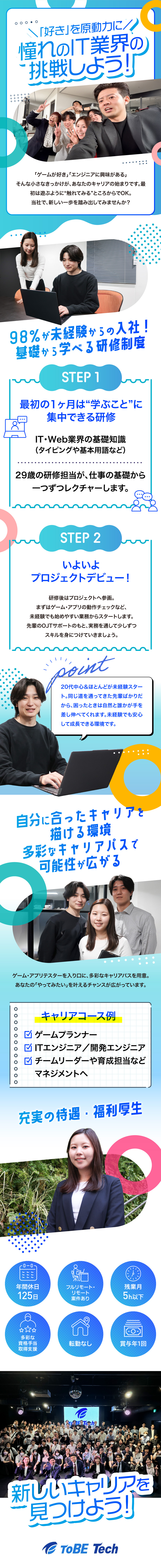 最初はテスターとして基礎を身につけ、その後は企画や開発など自分の興味に合わせたキャリアへ進むことができます。スキルアップ研修も豊富で、現場の先輩も相談しやすいので無理なく成長可能ですよ。