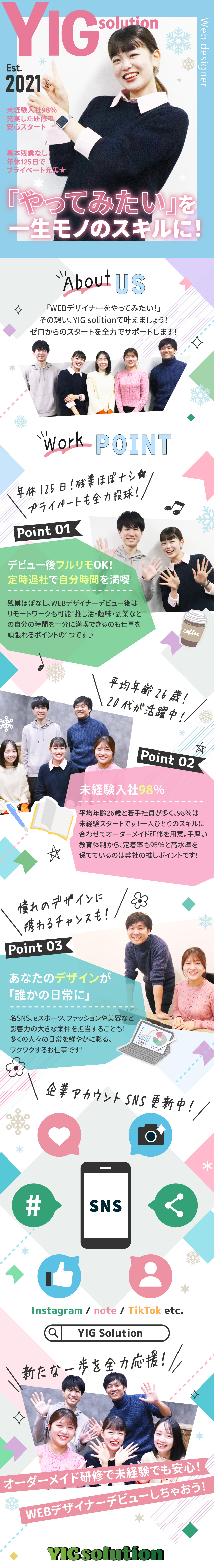 憧れのWebデザイナーになりたいと思い入社しました!未経験からでもイチから育成してもらえて、給与をもらいながら研修・学習できるところが当社の魅力です!詳細のキャリアも親身に相談に乗ってもらえます!