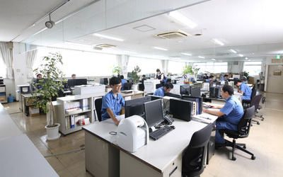 工場併設の事務所では、営業・生産技術・製造・技術部門が密に連携しながらお客様に向き合っています。特別な知識がなくても大丈夫。頼れる先輩ばかりなので、研修以外でも気軽に相談できる環境です。