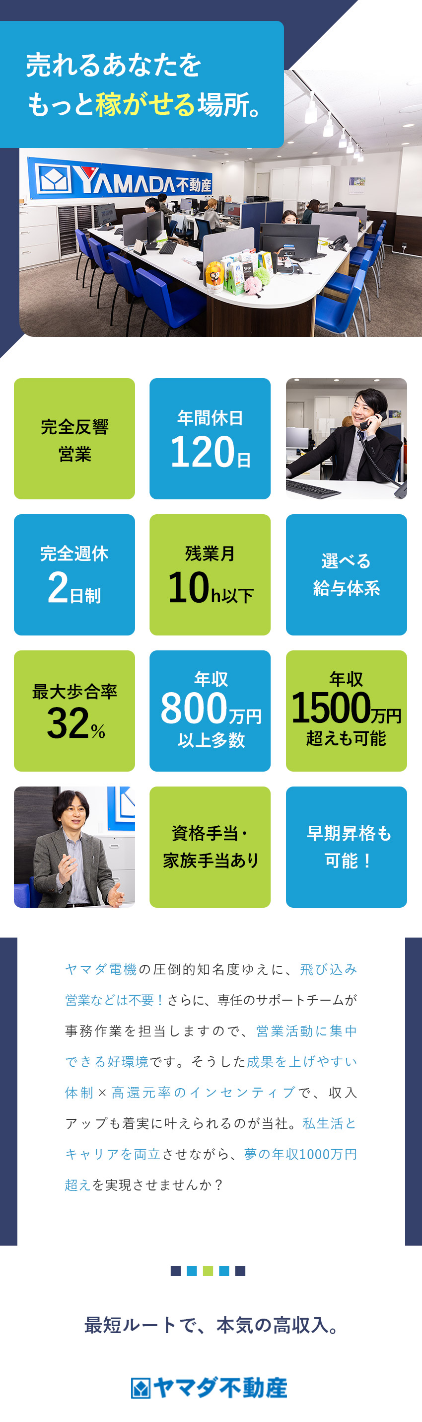 不動産営業/完全反響/年休120日/残業月10h/面接1回