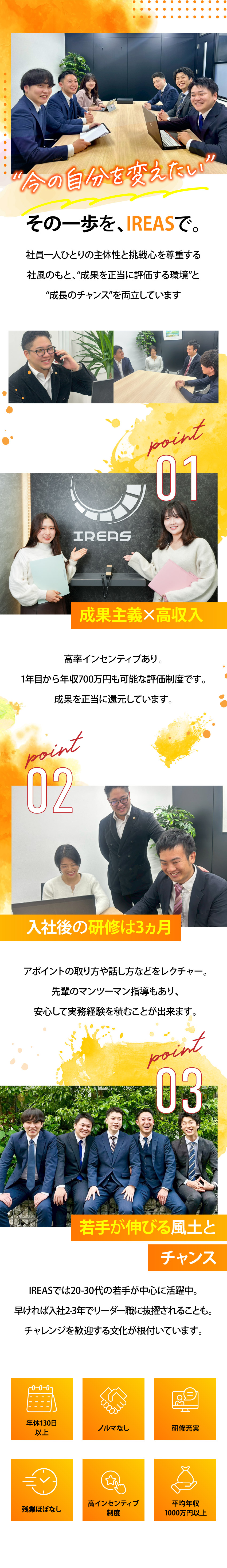成約につながるアポイントを獲得した場合にも、インセンティブが付与されることが同社の特徴のひとつです。頑張りが給与に反映されることを早期に経験できるため、「もっと頑張ろう」というモチベーションアップにもつながります。