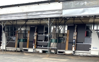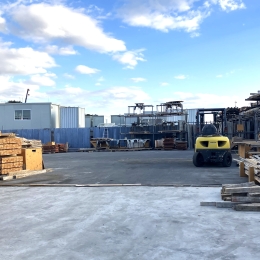 相模原の事務所兼資材置き場には、製材機を4台設置。照明設備も整っているため、夜間でも快適に作業ができます。