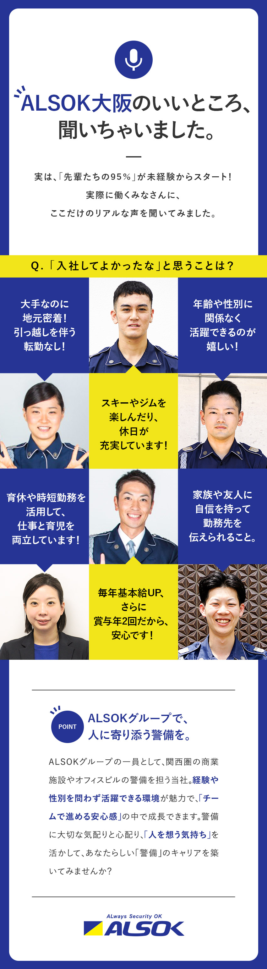 誰もが知る大手グループであり、大阪の地で地域に密着した事業展開を行うALSOK大阪株式会社。設立以来、「人の力」を軸とした警備で、関西エリアの「安心」と「安全」を守り続けています。