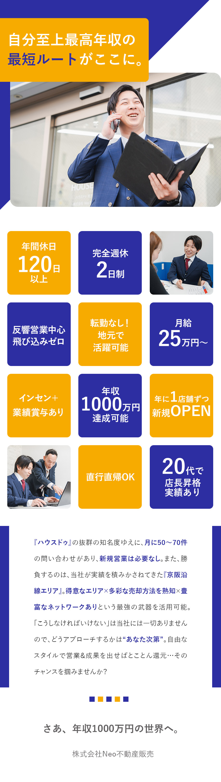 不動産営業/反響中心・飛び込み不要/年休120日/未経験歓迎