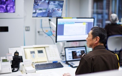 建物のセキュリティの中核となる防災センターで、監視カメラのモニター監視や自動火災報知設備など各種セキュリティ機器の異常信号に対応します。