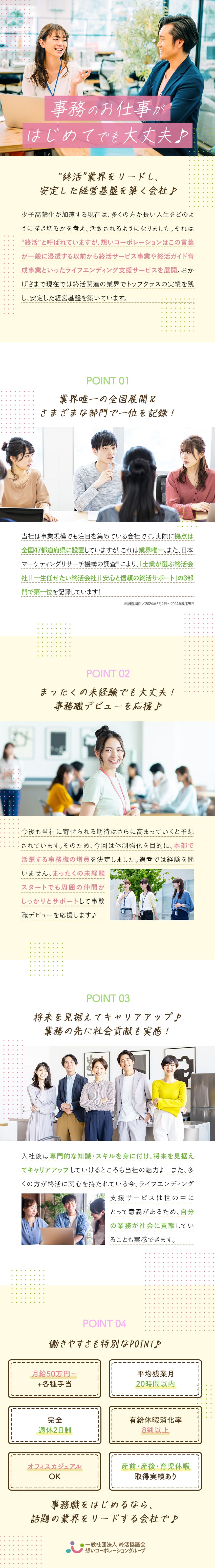 ライフエンディングを支える業務を通じて、専門的な知識が身につくのは同社の事務ならではだそう。多様な業務に関わる中で、専門性も着実に高まり、自分自身の将来にも役立つ学びが得られる環境だ。また、チームで連携しながらも、自ら提案・行動できる場面が多くある。努力や工夫はしっかり評価されるため、主体的に挑戦した分だけ、成長とやりがいを実感できるだろう。