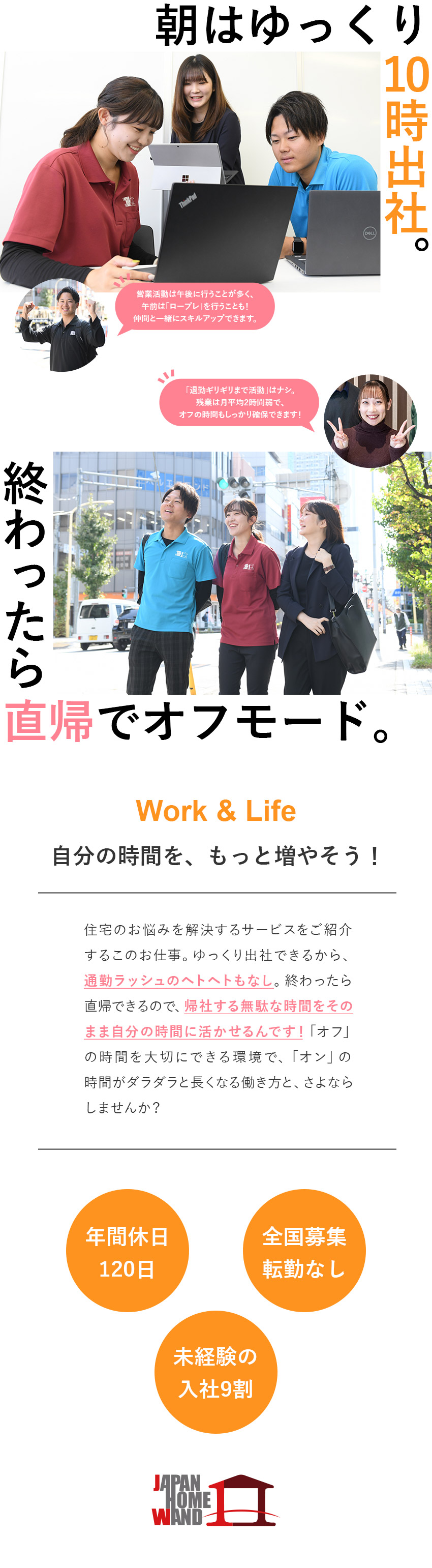 さらに、エリアでの営業活動時間は14時~18時が基本で、終わったら直帰もOK。残業は月平均2時間弱と、日中の効率を高めて、集中して業務に取り組めます!