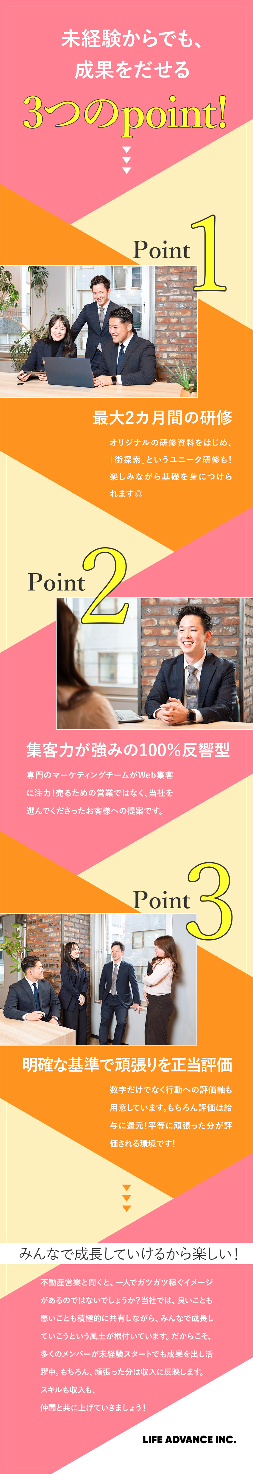 「不動産業界の仕事」というと、まだまだ「ブラックな仕事」「しつこい営業がある」「詐欺まがいのことがありそう」と思う方も多いのではないでしょうか。そんなイメージを根底から変えて、「みんなから憧れられる業界にしていく」。それを本気で目指しているのがライフアドバンスです。