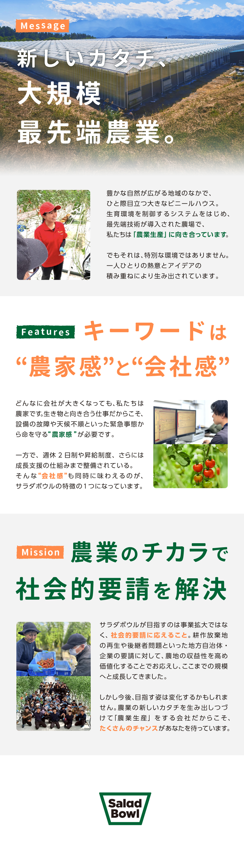 「農業の可能性を広げたい」「地域や社会に貢献したい」…。そして、「自分自身も成長したい」。そんな想いを持つ方にとって、サラダボウルは理想的なフィールドとなるはずです!