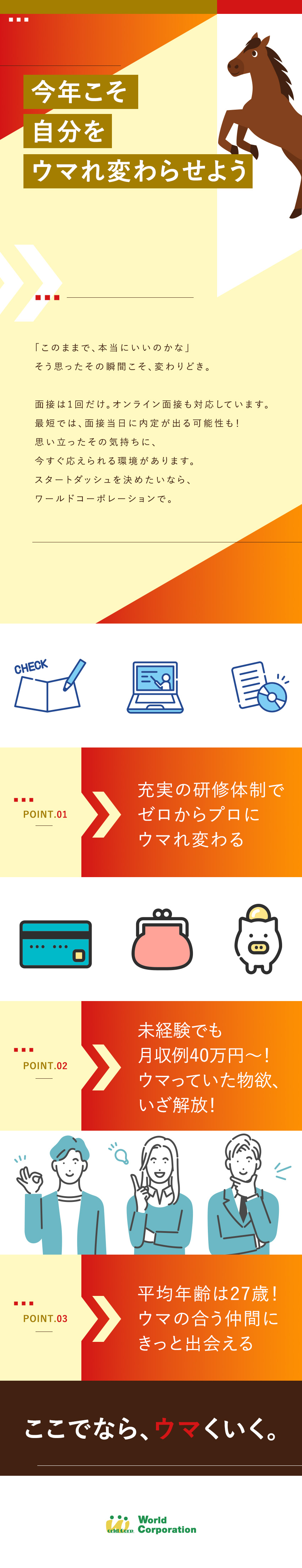 私たちワールドコーポレーションが重視しているのは、面接に来てくれた方の「将来を一緒に考えて、どうすれば良いキャリアが築けるか見つけること」です。 どのようなキャリアを磨いていけばちゃんと将来設計ができるのか、ワールドコーポレーションの中でどういった成長をすればスキルが身につくのかなどを、人事ならではの視点で丁寧にお教えしますし、あなたが納得する未来を一緒に考えていきます。