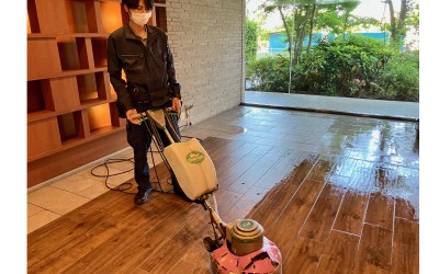 床清掃の様子。清掃用の機械を運ぶなどの補助的な仕事をお任せする場合もあります。