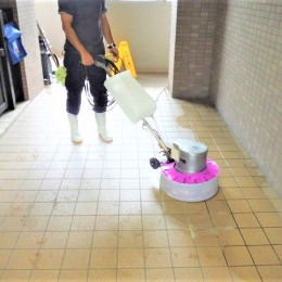 床清掃の様子。清掃用の機械を運ぶなどの補助的な仕事をお任せする場合もあります。