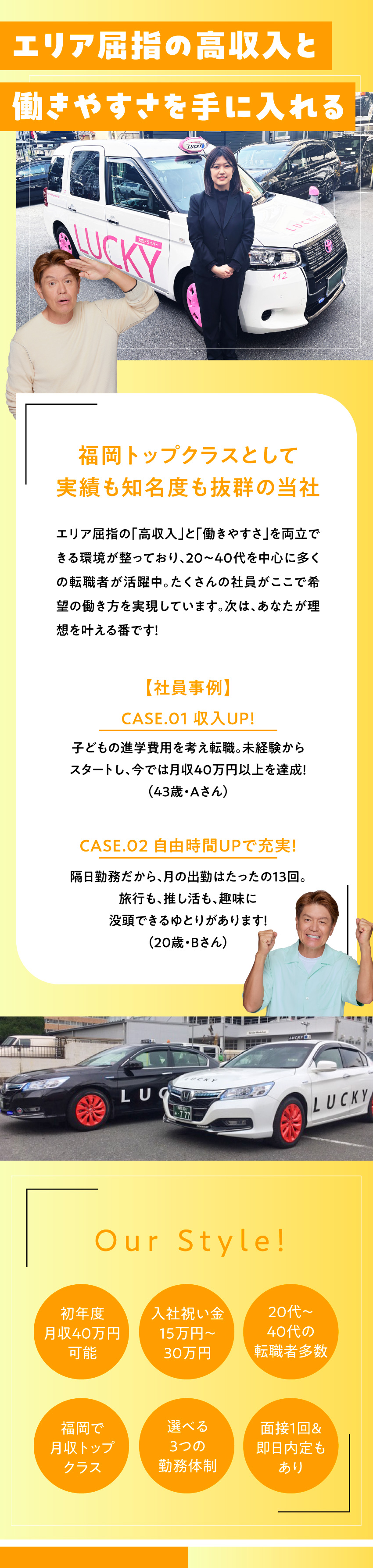増え続けるお客様に加えてドライバー不足が重なり、今、福岡は稼げるチャンスが広がっています。また2023年8月、福岡エリアを対象に初乗り運賃や迎車料金などの大きな料金改定が行われました。歩合制のため売上が給与にダイレクトに反映されるため、多くの社員が当社で大幅な年収アップを実現しています。