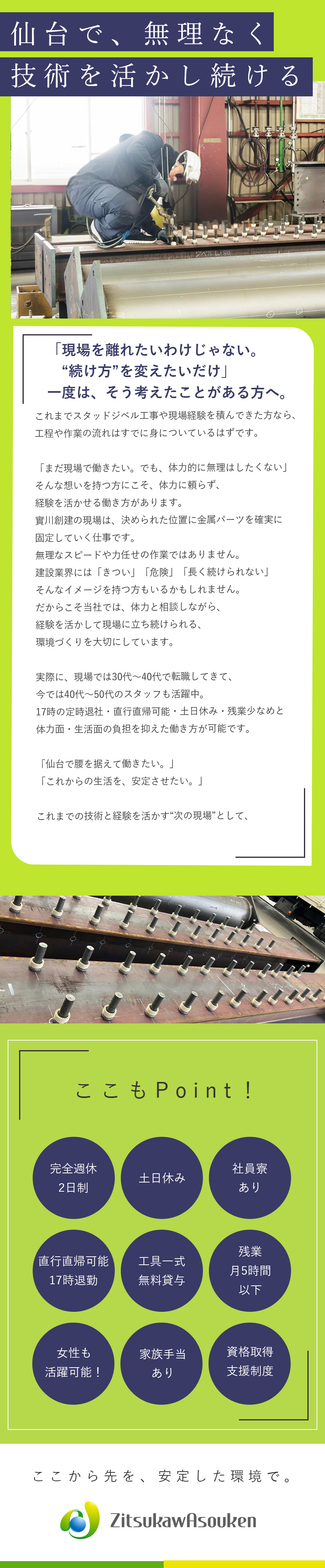 仙台/土日休・安定収入で続けるスタッドジベル工事という選択