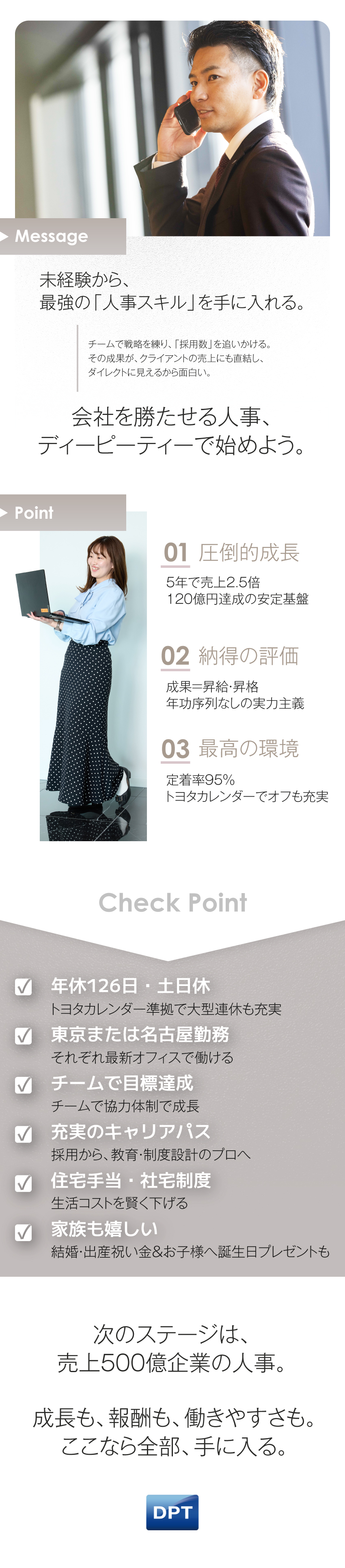 本社は名古屋・栄のランドマーク、中日ビル22階。さらに東京にも拠点を構え、5年で売上250%成長を遂げる同社。その躍進を裏側で支えているのが、今回募集する「エンジニア採用」のチームだ。 単なる事務作業ではなく、会社の収益源となる人材獲得を担う重要なポジション。