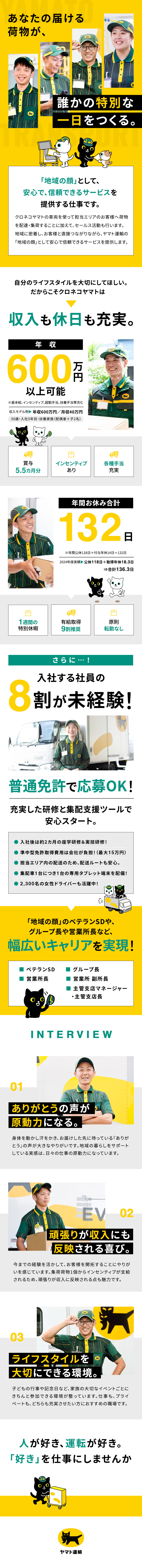 クロネコヤマトの車両を使って担当エリアのお客様へ荷物を配達・集荷する仕事です。