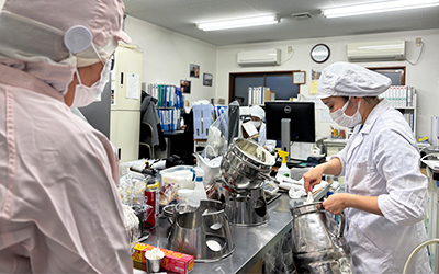 本社を訪問すると、開発部では試作品の評価が行われていました。「うちの強みは、比較的自由に商品開発に取り組める点です」と担当者。実際、従来の枠にとらわれない新商品や新ビジネスの立案も奨励されており、本社前の冷凍自動販売機もそうした挑戦の一つだそうです。「開発した商品が有名なスイーツや料理に採用されることもあり、やりがいを感じられます」。OJTでの丁寧な指導体制や、外部研修・資格取得の費用負担制度も整い、成長を支える環境が整っています。