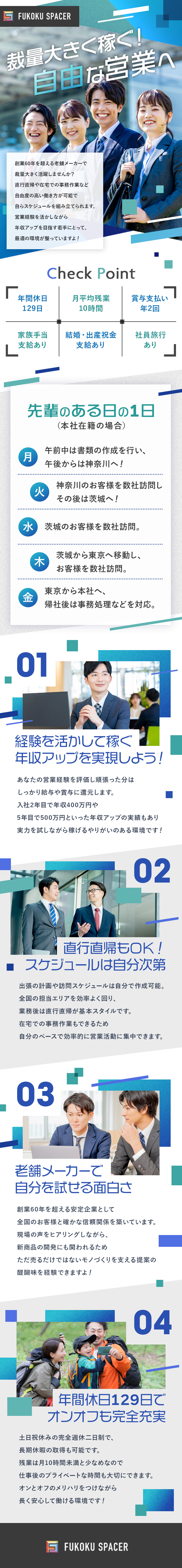 既存顧客中心の法人営業/年休129日/残業10h/直行直帰可