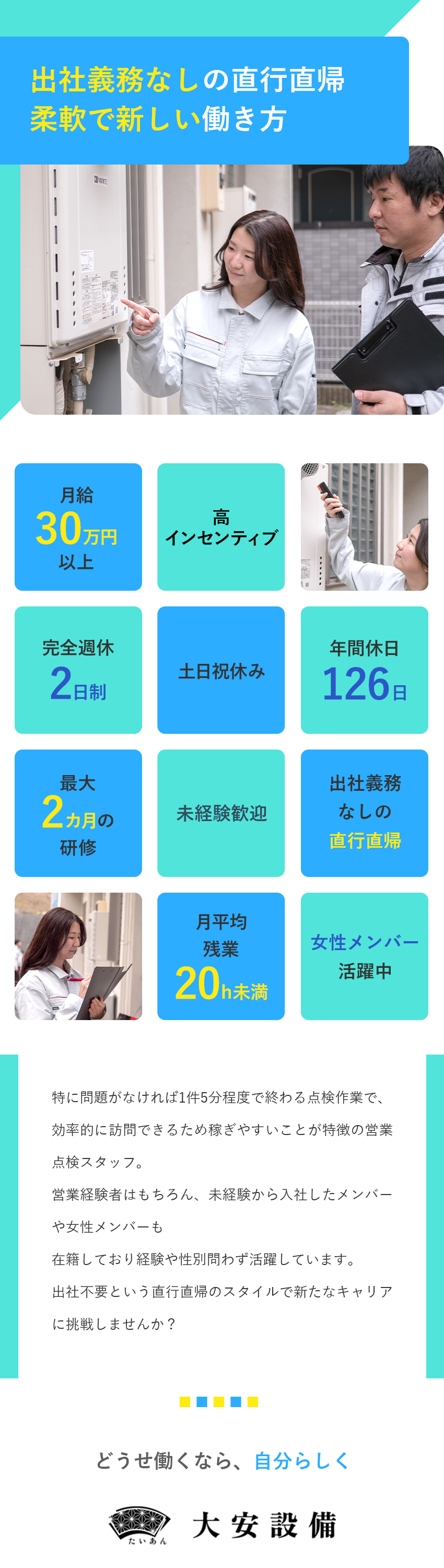 今回、募集する営業点検スタッフは、アポイントを自分で取る必要がなく、点検作業をすることで、お客さまから喜んでいただける仕事のため、ゆとりも持ち、働くことが可能。