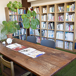 ミーティングや社内外の会食、休憩場所として使われているスペース。本棚にはうつわ関連の他、書籍が多数
