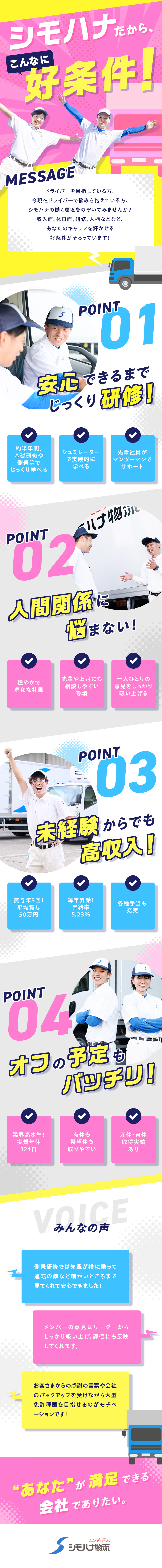 ルーティンワークで流れ作業にならないよう、同社の環境を活かし、自ら積極的にスキルアップしていく向上心が求められます。資格取得支援制度もあり、中型・大型免許の取得なども目指せるので、しっかりと活用しキャリアの幅を広げていくことでさらに活躍できるようになるでしょう。