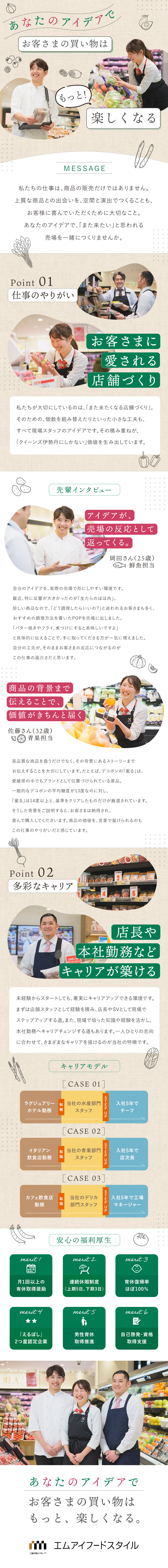 また今回はスーパーマーケット事業の店舗スタッフ募集ですが、百貨店での店舗スタッフ配属も可能です。ご希望される方はぜひ面接にてその旨をお話しください!