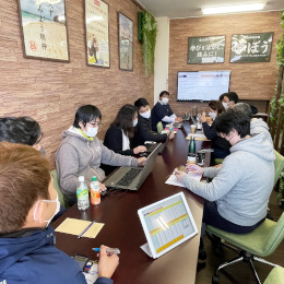 全体会議の様子。フルリモート勤務が基本ですが、月に1度は全員が出社して話し合う機会を設けています。