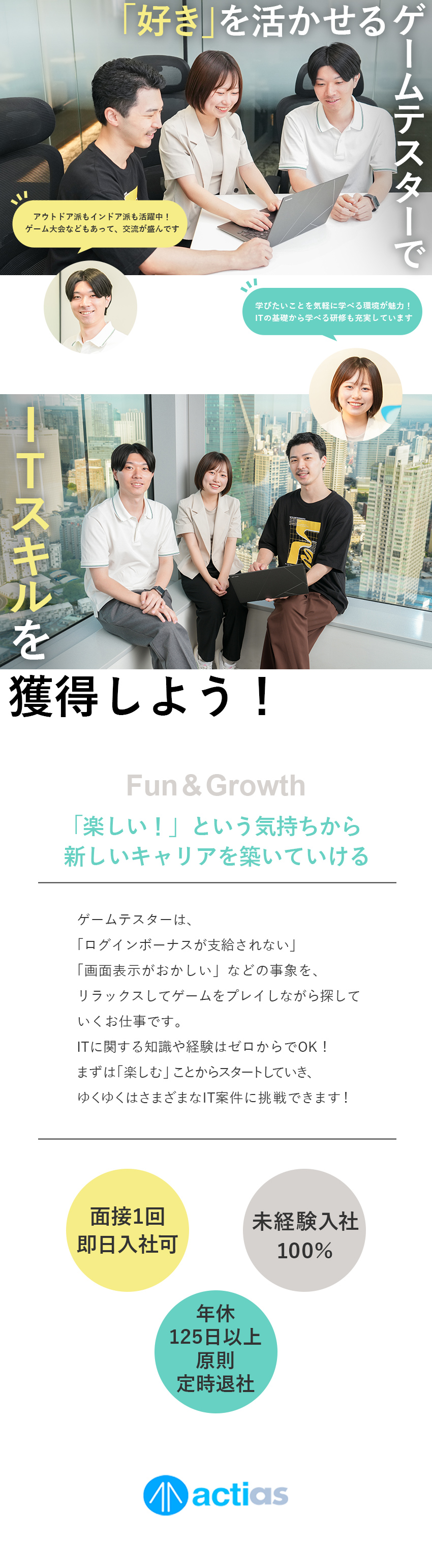 ゲームテスター/面接1回/残業少/年休125日/即日内定可