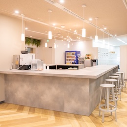 オフィス内には気軽にコーヒーを飲んだり、雑談ができるカフェ風スペースあり。