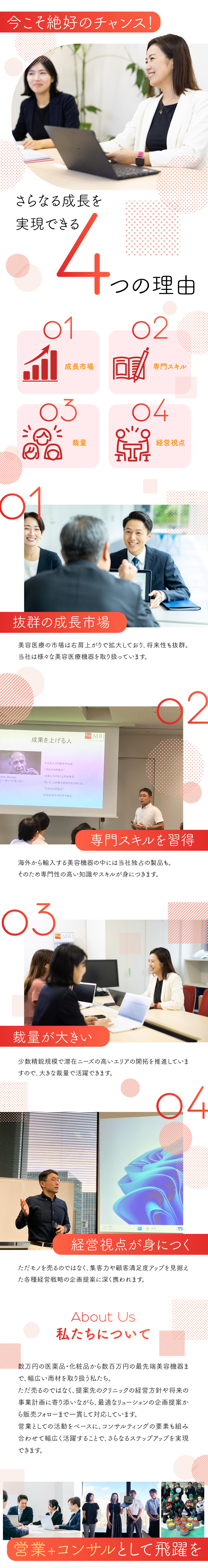 本ポジションでは、国内のドクターやクリニックに対し、最新の美容医療機器・製剤の情報提供や提案営業を行っていただきます。