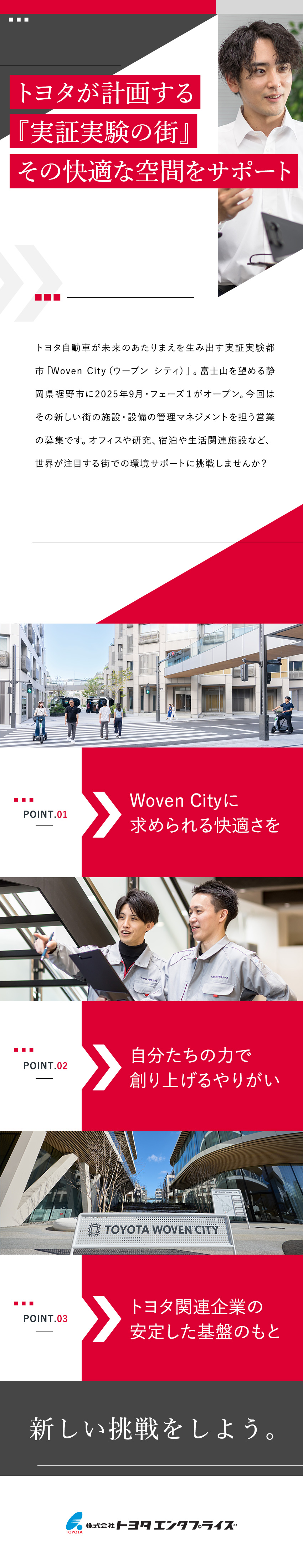 場所は静岡県裾野市にあるトヨタ自動車東日本の旧東富士工場跡地。一大都市を構築する壮大なプロジェクトがはじまりました。2025年9月25日に“街びらき”されたばかりの「Woven City(ウーブン シティ)」。トヨタグループ12社のほか、空調・飲料・食品・教育・宇宙・製薬など、さまざまな分野の企業が集まり、世界の注目を集める実証実験が幕を開けました。この街の施設・設備の管理マネジメントを担う本ポジションも、業界をリードする新たな技術や取り組みに挑戦中!他に例を見ない街づくりに関われるチャンスです。