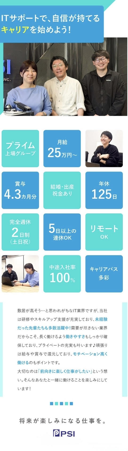 ITサポート/未経験歓迎/年休125日/賞与4.3カ月